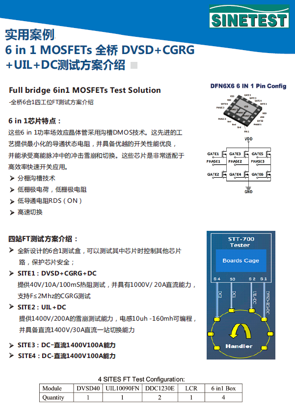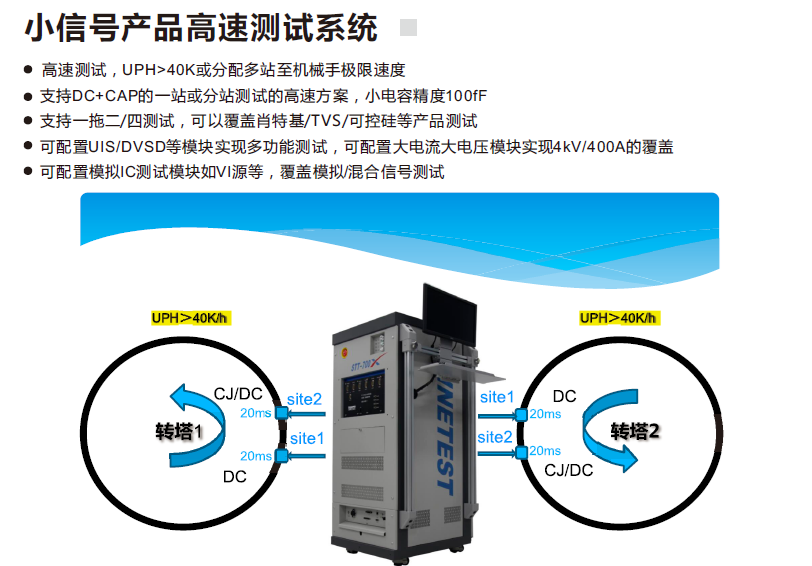 赛英特拥有专利的功率器件模块化设计,让我们可以轻松灵活的组合各种模块如直流/热阻/雪崩/RGCR/QG/SW等(部分需外置盒子)构建测试方案,应对各种测试需求。下面为我们各种精彩的测试方案供参考:小功率产品高速测试方案真正晶圆级IGBT/SIC直流+动态开关参数量产测试方案 👉IGBT/Mosfet DC+UIL+RGCG 8/16/32工位晶圆测试方案双芯mosfet成品高速测试方案(Index Parallel)6合1 Mosfet模块测试方案SIC/GAN 多工位晶圆测试方案晶圆级SIC/IGBT双脉冲开关参数测试视频(请联系索取)二极管晶圆级小trr测试方案 (<4ns)可配置的模块资源列表